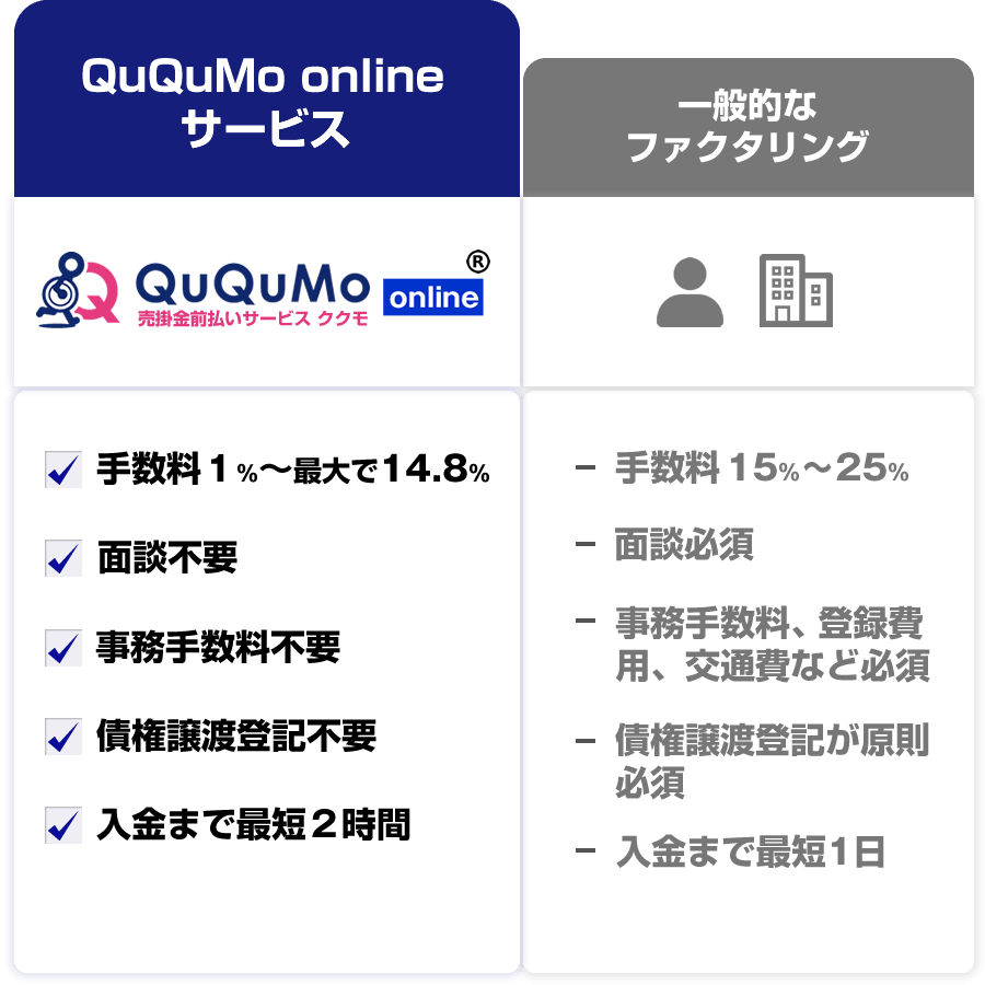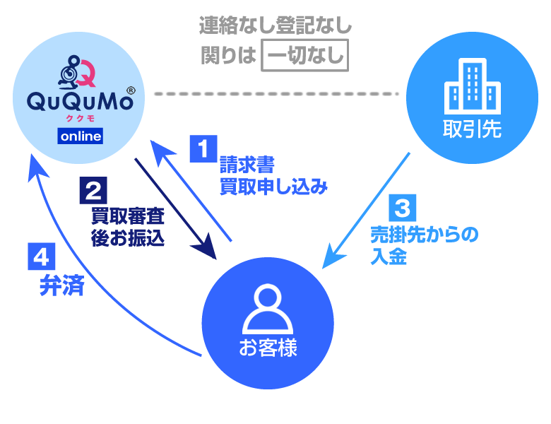 売掛先の倒産リスクも含めてお買取をさせていただきますので、お客様に返済の義務はございません。QuQuMo(ククモ)ではノンリコース【償還請求権なし】での契約になりますのでご安心ください